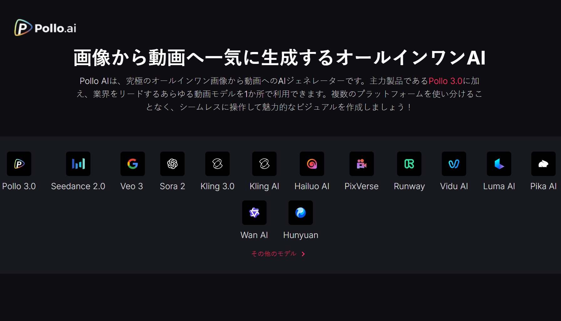 さらに特徴的なのは、単一モデルではなく「Pollo 3.0」を中心に、Veo、Sora、Kling、Runway、Luma、Pikaなど業界トップレベルの複数動画生成モデルを一つの環境で利用できる点です。