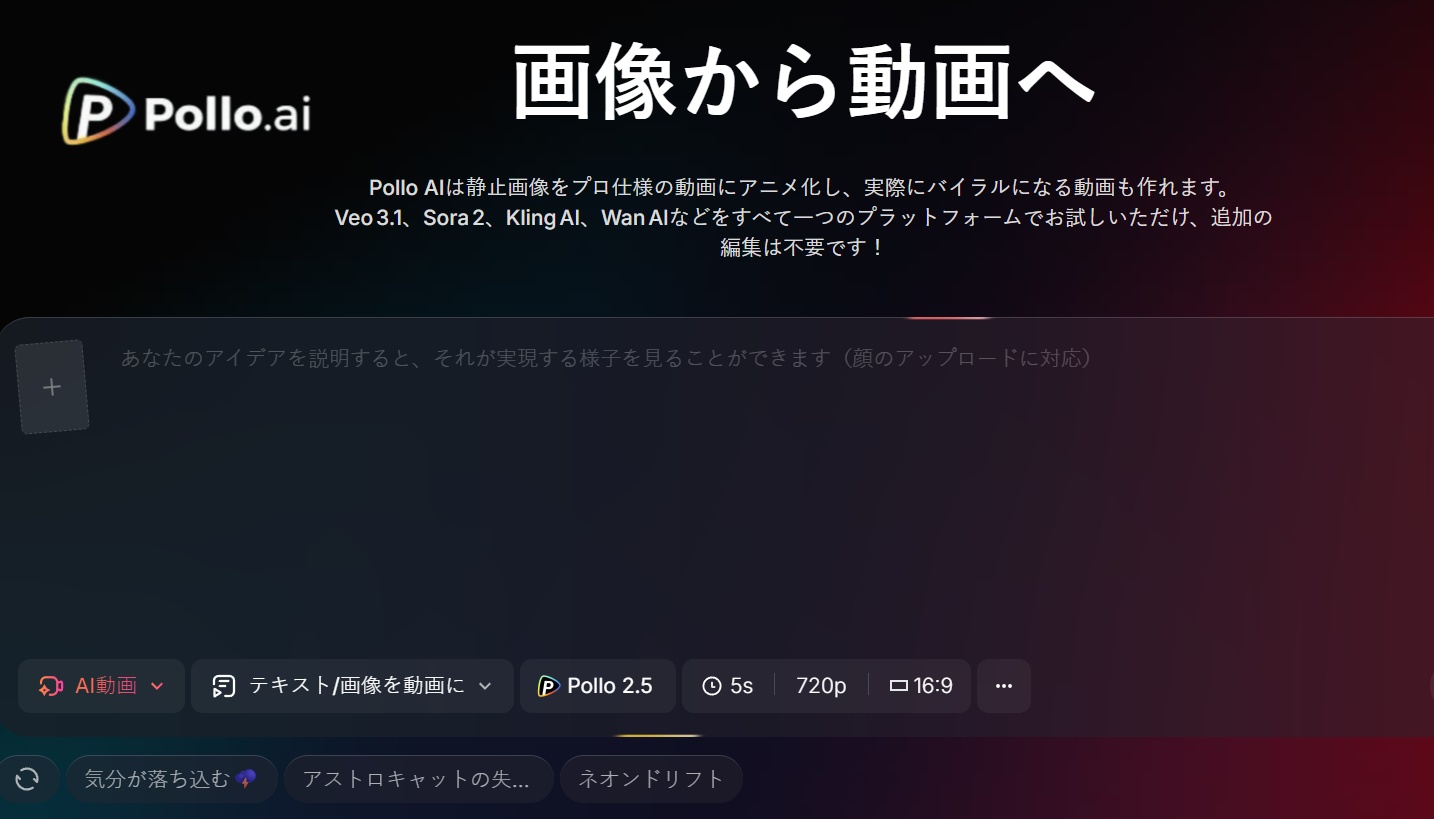 Pollo AIは、画像から動画 AIの中でも最も完成度の高いオールインワン型プラットフォームとして設計されており、静止画像をプロ仕様の動画へと自動変換できる次世代AIツールです。